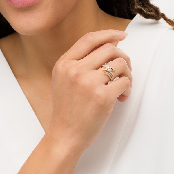 Crafted in warm 10K gold, this split-pronged ring features a subtle bypass design with a curved polished and diamond-lined ribbon. Featuring 1/8 carat diamonds with a dazzling polished luster, this ring is uniquely yours.