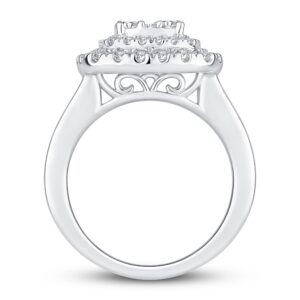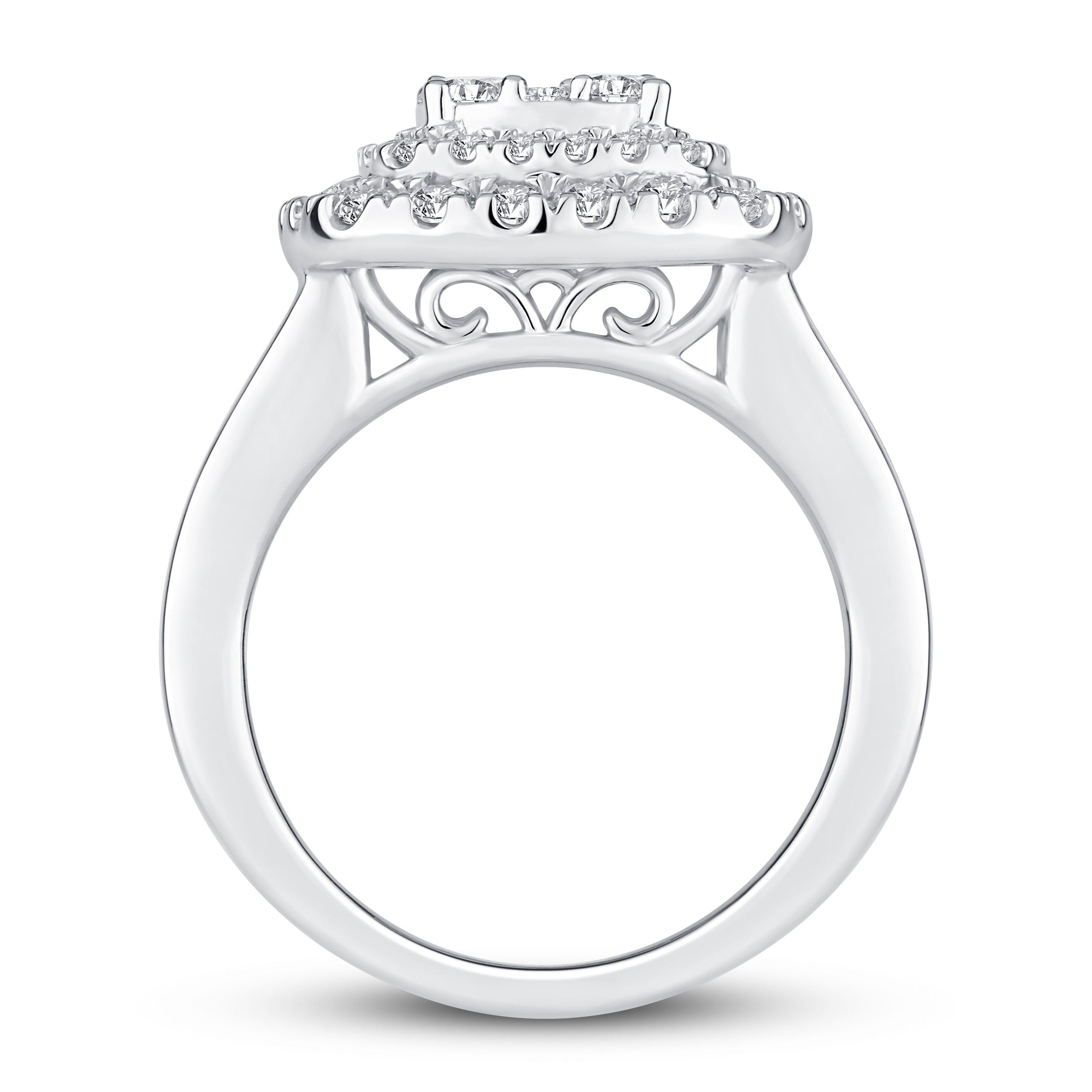 This breathtaking women’s engagement ring features a myriad of brilliant round diamonds stacking atop a 14K white gold band. Sparkling diamonds line halfway down each side of the band to bring the total diamond weight to an impressive 2 carats.