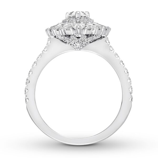 This breathtaking Neil Lane Studio engagement ring celebrates the glamour and elegance of the past. The dazzling center showcases a 1/2-carat pear-shaped diamond encircled by round diamonds. A burst of pear, round, and baguette diamonds completes the frame. Styled in polished 14K white gold, the ring has a total diamond weight of 1 7/8 carats.